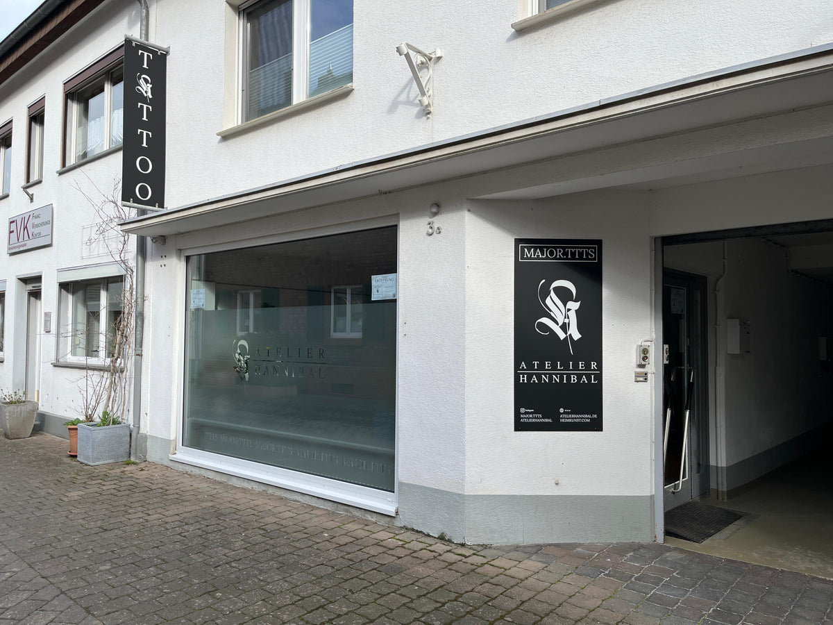 Das Atelier Hannibal in Erftstadt-Lechenich ist deine erste Adresse für professionelle Tattoos. Zentral gelegen direkt hinter dem Markt, in einer ruhigen Seitenstraße (Franz-Busbach-Str. 3a).